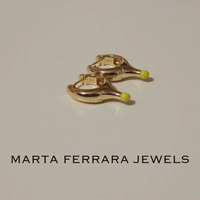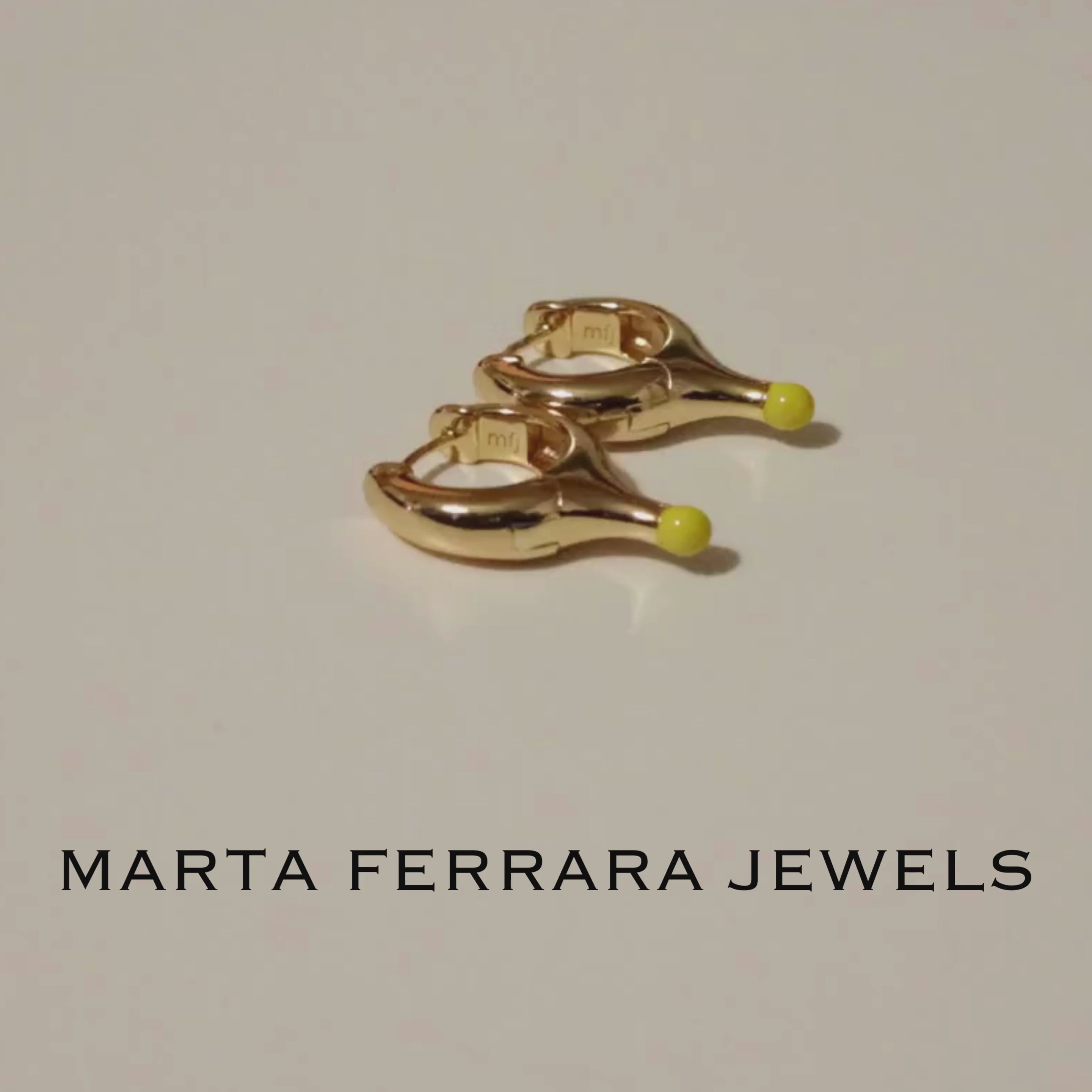 Gli orecchini firmati Marta Ferrara Jewels, realizzati in argento 925 placcato oro giallo 18 carati, uniscono linee essenziali a un dettaglio distintivo: una sfera smaltata a mano che aggiunge un accento cromatico deciso, ma armonioso.